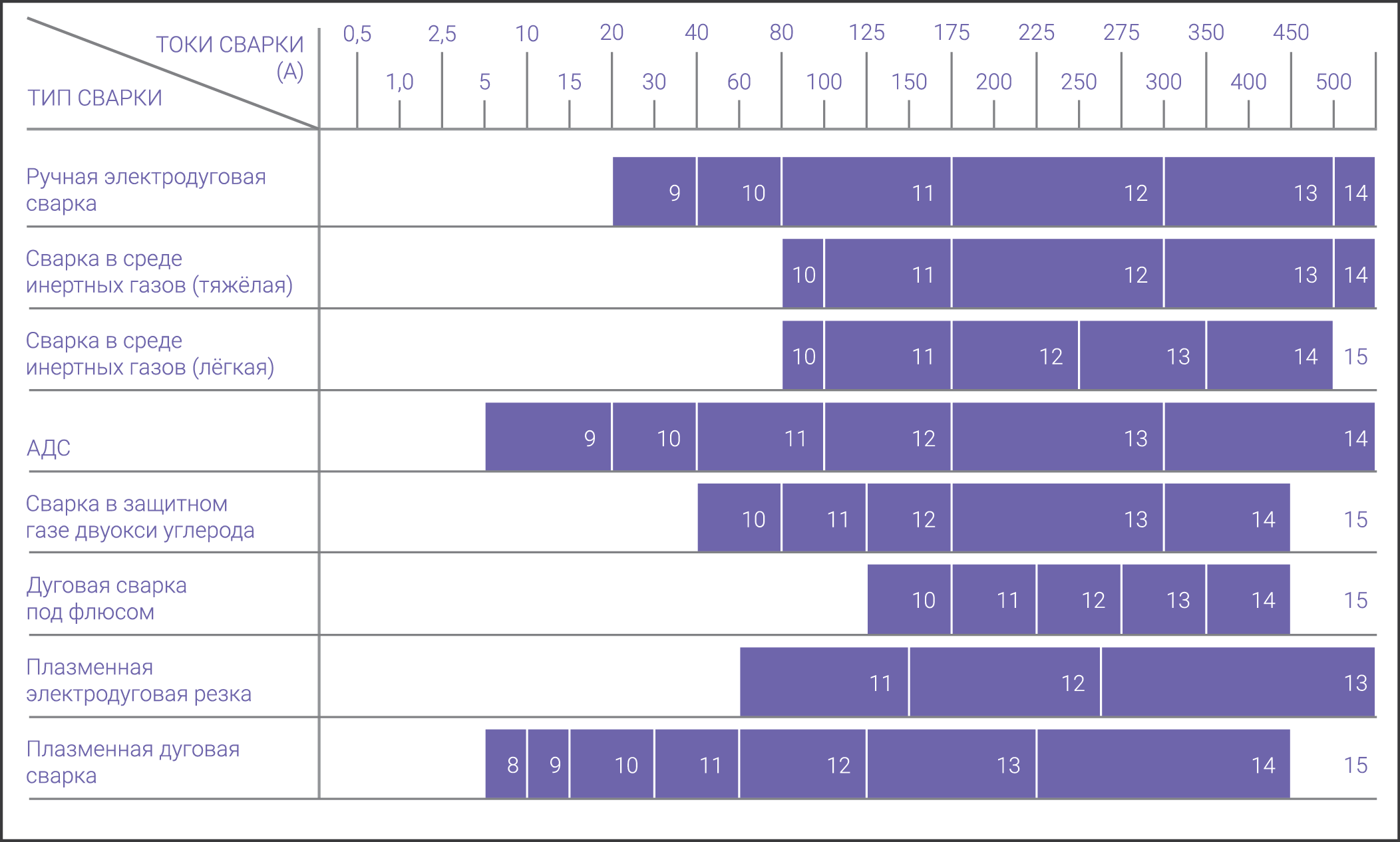 С помощью таблицы затемнения определите степень, соответствующую условиям работы.
